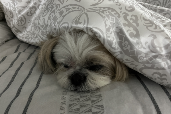 ▲最近になって、布団の中で寝るのはとても暖かくて幸せ❤️と気づいた犬