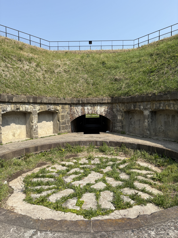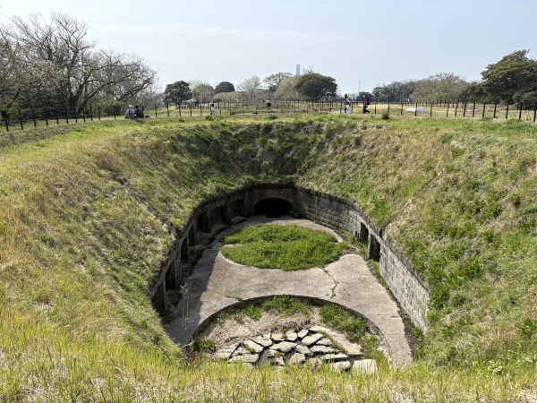 この円形の穴が砲台跡ですね。ここに大砲がどんと乗っていました。